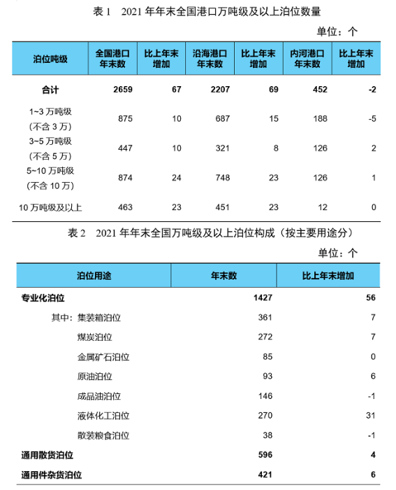 年末全國(guó)港口萬噸級(jí)及以上泊位2659個(gè),比上年末增加67個(gè)。從分布結(jié)構(gòu)看,沿海港口萬噸級(jí)及以上泊位2207個(gè)、增加69個(gè),內(nèi)河港口萬噸級(jí)及以上泊位452個(gè)、減少2個(gè)。從用途結(jié)構(gòu)看,專業(yè)化萬噸級(jí)及以上泊位1427個(gè)、增加56個(gè),通用散貨萬噸級(jí)及以上泊位596個(gè)、增加4個(gè),通用件雜貨泊位421個(gè)、增加6個(gè)。