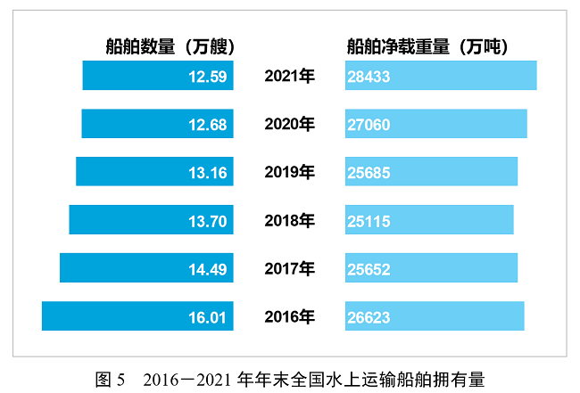年末全國(guó)擁有水上運(yùn)輸船舶12.59萬艘,比上年末下降0.7%,其中凈載重量28432.63萬噸、增長(zhǎng)5.1%,載客量85.78萬客位、下降0.3%,集裝箱箱位288.43萬標(biāo)準(zhǔn)箱、下降1.6%。