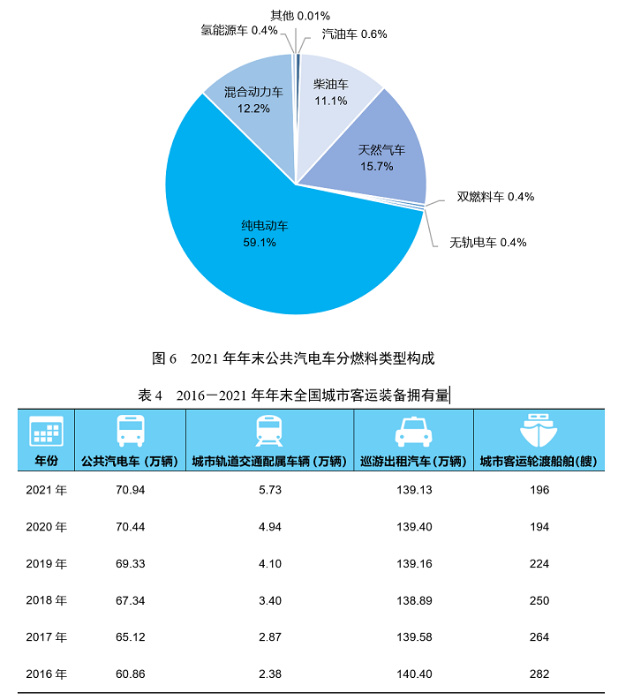 年末全國(guó)擁有城市公共汽電車70.94萬輛,比上年末增長(zhǎng)0.7%,其中純電動(dòng)車41.95萬輛、增長(zhǎng)10.8%,占整個(gè)城市公共汽電車比重為59.1%、提高5.4個(gè)百分點(diǎn)。擁有城市軌道交通配屬車輛5.73萬輛,增長(zhǎng)15.9%。擁有巡游出租汽車139.13萬輛,下降0.2%。擁有城市客運(yùn)輪渡船舶196艘,增長(zhǎng)1.0%。