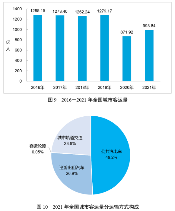 全年完成城市客運(yùn)量993.84億人,比上年增長(zhǎng)14.0%。其中,公共汽電車客運(yùn)量489.16億人、運(yùn)營(yíng)里程335.27億公里,分別增長(zhǎng)10.6%和10.7%,城市軌道交通客運(yùn)量237.27億人、增長(zhǎng)34.9%,巡游出租汽車客運(yùn)量266.90億人、增長(zhǎng)5.4%,城市客運(yùn)輪渡客運(yùn)量0.51億人、增長(zhǎng)30.5%。