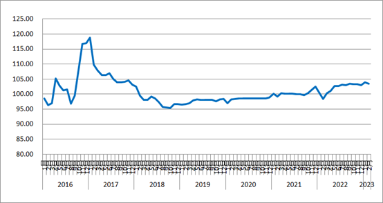圖1 2016年以來各月中國公路物流運價指數(shù)