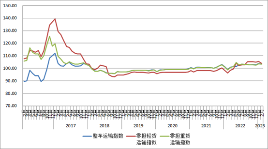 分車型指數(shù)看,各車型指數(shù)環(huán)比均有回落,同比去年保持增長。以大宗商品及區(qū)域運輸為主的整車指數(shù)為103.3點,比上月回落0.33%,比上年同期增長4.5%。零擔(dān)指數(shù)中,零擔(dān)輕貨指數(shù)為103.8點,比上月回落1.66%,比上年同期增長7.9%;零擔(dān)重貨指數(shù)為103.3點,比上月回落0.28%,比上年同期增長4.6%。