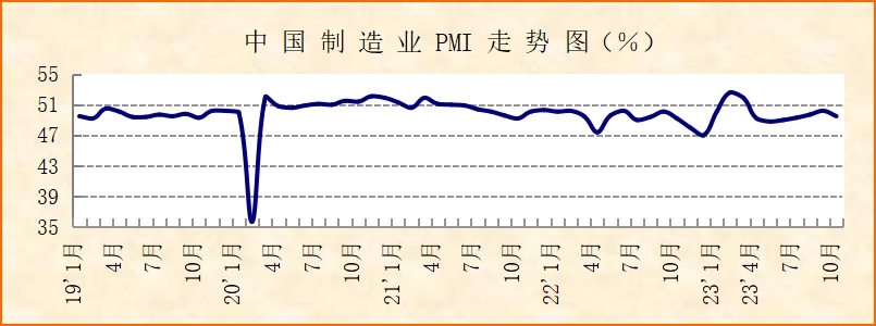 中國物流與采購聯(lián)合會、國家統(tǒng)計局服務業(yè)調(diào)查中心發(fā)布的2023年10月份中國制造業(yè)采購經(jīng)理指數(shù)(PMI)為49.5%,較上月下降0.7個百分點。從分項指數(shù)變化來看,制造業(yè)市場需求受季節(jié)性影響有所波動,但企業(yè)生產(chǎn)活動仍持穩(wěn)運行,裝備和消費品制造業(yè)生產(chǎn)保持增長,原材料價格增速也高位放緩,企業(yè)對后市預期保持樂觀。四季度,在市場內(nèi)生動力穩(wěn)定釋放以及穩(wěn)經(jīng)濟政策進一步發(fā)力的情況下,經(jīng)濟回穩(wěn)向好運行具備基礎。