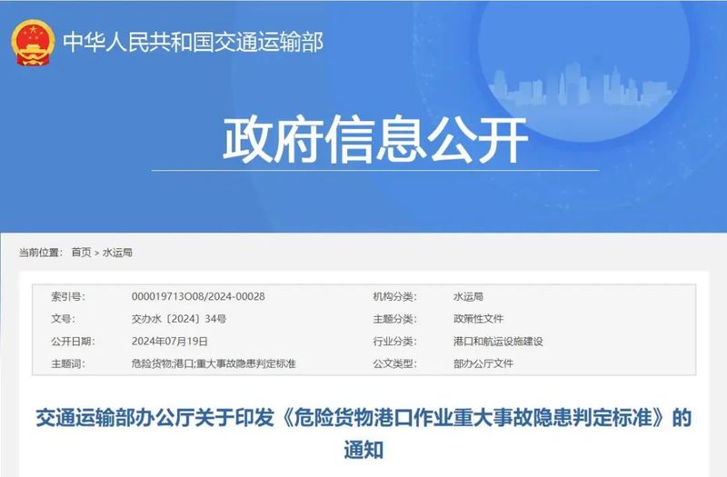 《危險(xiǎn)貨物港口作業(yè)重大事故隱患判定標(biāo)準(zhǔn)》 解讀 一、有關(guān)背景 2016年,我部制定印發(fā)了《危險(xiǎn)貨物港口作業(yè)重大事故隱患判定指南》(交水辦〔2016〕178號(hào))(以下簡(jiǎn)稱《判定指南》),有效指導(dǎo)了各地排查治理危險(xiǎn)貨物港口作業(yè)重大事故隱患工作。近些年來(lái),我部相繼制修訂了《港口危險(xiǎn)貨物安全管理規(guī)定》等規(guī)章及政策文件,推動(dòng)發(fā)布了港口作業(yè)安全要求多項(xiàng)強(qiáng)制性國(guó)家標(biāo)準(zhǔn),對(duì)危險(xiǎn)貨物港口作業(yè)提出了新要求;同時(shí),《判定指南》在實(shí)施過(guò)程中有的地方也出現(xiàn)了個(gè)別條款理解不精準(zhǔn)、針對(duì)性不突出、主觀擴(kuò)大認(rèn)定等情況。 按照國(guó)務(wù)院安委會(huì)《安全生產(chǎn)治本攻堅(jiān)三年行動(dòng)方案(2024—2026年)》及部相關(guān)部署要求,我部在原《判定指南》基礎(chǔ)上組織研究制定了《危險(xiǎn)貨物港口作業(yè)重大事故隱患判定標(biāo)準(zhǔn)》(以下簡(jiǎn)稱《判定標(biāo)準(zhǔn)》)。 二、主要修訂內(nèi)容 《判定標(biāo)準(zhǔn)》維持原《判定指南》框架結(jié)構(gòu)不變,從超范圍超能力超期限作業(yè)、設(shè)備設(shè)施不滿足作業(yè)安全要求、安全設(shè)施配備不滿足作業(yè)安全要求、安全距離(間距)不符合規(guī)定、安全管理存在重大缺陷等五個(gè)方面規(guī)定了25項(xiàng)重大事故隱患情形。主要修訂內(nèi)容如下。 一是增強(qiáng)標(biāo)準(zhǔn)的操作性和實(shí)用性。修改完善了防火、防爆、防雷、防靜電等方面可操作性不強(qiáng)的相關(guān)內(nèi)容。 二是突出重點(diǎn)領(lǐng)域隱患排查。重點(diǎn)針對(duì)危險(xiǎn)貨物作業(yè)場(chǎng)所的消防控制室、中心控制室和構(gòu)成一級(jí)、二級(jí)重大危險(xiǎn)源罐區(qū)等細(xì)化了重大事故隱患判定要求。 三是突出防范新風(fēng)險(xiǎn)、解決新問(wèn)題。重點(diǎn)從全員安全生產(chǎn)責(zé)任制、雙重預(yù)防機(jī)制、高風(fēng)險(xiǎn)作業(yè)區(qū)域人員行為管理、儲(chǔ)罐浮盤(pán)落底作業(yè)、動(dòng)火作業(yè)等方面補(bǔ)充了相關(guān)內(nèi)容。 各省、自治區(qū)、直轄市交通運(yùn)輸廳(委): 為貫徹落實(shí)習(xí)近平總書(shū)記關(guān)于安全生產(chǎn)的重要論述,深入排查治理危險(xiǎn)貨物港口作業(yè)重大事故隱患,根據(jù)《中華人民共和國(guó)安全生產(chǎn)法》《中華人民共和國(guó)港口法》《危險(xiǎn)化學(xué)品安全管理?xiàng)l例》《港口經(jīng)營(yíng)管理規(guī)定》《港口危險(xiǎn)貨物安全管理規(guī)定》等有關(guān)法律法規(guī)規(guī)章和標(biāo)準(zhǔn),我部組織編制了《危險(xiǎn)貨物港口作業(yè)重大事故隱患判定標(biāo)準(zhǔn)》,現(xiàn)印發(fā)給你們,請(qǐng)遵照?qǐng)?zhí)行。執(zhí)行中的重要情況,請(qǐng)及時(shí)向部水運(yùn)局反映。 交通運(yùn)輸部辦公廳 2024年7月8日 (此件公開(kāi)發(fā)布) 危險(xiǎn)貨物港口作業(yè)重大事故隱患判定標(biāo)準(zhǔn) 第一條 為了準(zhǔn)確判定、及時(shí)消除危險(xiǎn)貨物港口作業(yè)重大事故隱患(以下簡(jiǎn)稱重大事故隱患),根據(jù)《中華人民共和國(guó)安全生產(chǎn)法》《中華人民共和國(guó)港口法》《危險(xiǎn)化學(xué)品安全管理?xiàng)l例》《港口經(jīng)營(yíng)管理規(guī)定》《港口危險(xiǎn)貨物安全管理規(guī)定》等法律、行政法規(guī)、規(guī)章和交通運(yùn)輸部有關(guān)安全生產(chǎn)事故隱患治理的規(guī)定,制定本標(biāo)準(zhǔn)。 第二條 本標(biāo)準(zhǔn)適用于危險(xiǎn)貨物港口經(jīng)營(yíng)人港口作業(yè)重大事故隱患判定工作。 第三條 危險(xiǎn)貨物港口作業(yè)重大事故隱患包括以下5個(gè)方面: (一)存在超范圍、超能力、超期限作業(yè)情況,或者危險(xiǎn)貨物存放不符合作業(yè)安全要求的; (二)危險(xiǎn)貨物港口作業(yè)設(shè)備設(shè)施不滿足作業(yè)安全要求的; (三)危險(xiǎn)貨物港口作業(yè)場(chǎng)所的安全設(shè)施配備不滿足作業(yè)安全要求的; (四)危險(xiǎn)貨物港口作業(yè)場(chǎng)所或儲(chǔ)運(yùn)設(shè)備設(shè)施的安全距離(間距)不符合規(guī)定的; (五)安全管理存在重大缺陷的。 第四條 “存在超范圍、超能力、超期限作業(yè)情況,或者危險(xiǎn)貨物存放不符合作業(yè)安全要求的”重大事故隱患,是指有下列情形之一的: (一)超出《港口經(jīng)營(yíng)許可證》《港口危險(xiǎn)貨物作業(yè)附證》許可范圍從事易燃易爆、毒性、放射性等危險(xiǎn)特性的危險(xiǎn)貨物作業(yè)的; (二)超出儲(chǔ)罐的設(shè)計(jì)溫度、壓力、液位儲(chǔ)存危險(xiǎn)貨物或者超出介質(zhì)儲(chǔ)存溫度儲(chǔ)存危險(xiǎn)貨物,且未及時(shí)處理的;超出管道的設(shè)計(jì)溫度、壓力輸送危險(xiǎn)貨物或者超出介質(zhì)的輸送溫度、安全流速輸送危險(xiǎn)貨物,且未及時(shí)處理的; (三)危險(xiǎn)貨物作業(yè)碼頭按照有關(guān)規(guī)定檢測(cè)評(píng)估后,明確應(yīng)當(dāng)停止或者限制使用,但未停止或者限制使用的;港口危險(xiǎn)貨物儲(chǔ)罐經(jīng)檢查、檢測(cè),不具備安全生產(chǎn)條件,但