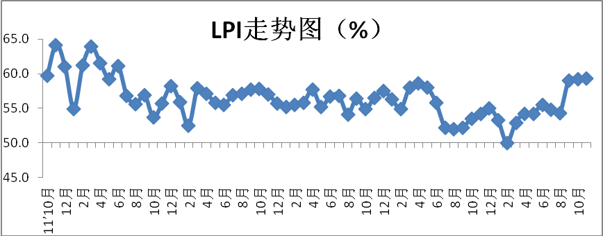 平均庫存量指數(shù)和庫存周轉(zhuǎn)次數(shù)指數(shù)雙雙回升。11月份,平均庫存量指數(shù)回升1個(gè)百分點(diǎn),為58.8%,庫存周轉(zhuǎn)次數(shù)指數(shù)回升0.9個(gè)百分點(diǎn),為58%,該兩項(xiàng)指數(shù)雙雙回升且保持在50%以上的景氣區(qū)間,表明經(jīng)濟(jì)活動(dòng)仍然較為活躍,同時(shí)表明物流效率有所提升。
