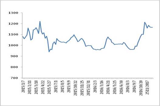 圖 1 2015-2016年各周中國公路物流運(yùn)價(jià)指數(shù)