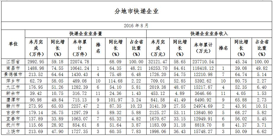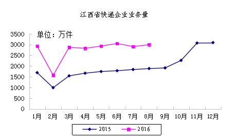 8月份,全省快遞服務企業(yè)業(yè)務量累計完成22074.78萬件,同比增長68.09%,全國排第16位;業(yè)務收入累計完成23.77億元,同比增長45.34%,全國排第17位。其中,同城業(yè)務收入累計完成2.53億元,同比增長98.77%;異地業(yè)務收入累計完成15.75億元,同比增長38.51%;國際及港澳臺業(yè)務收入累計完成1.05億元,同比增長47.10%??爝f業(yè)務投遞量累計完成33286.94萬件。