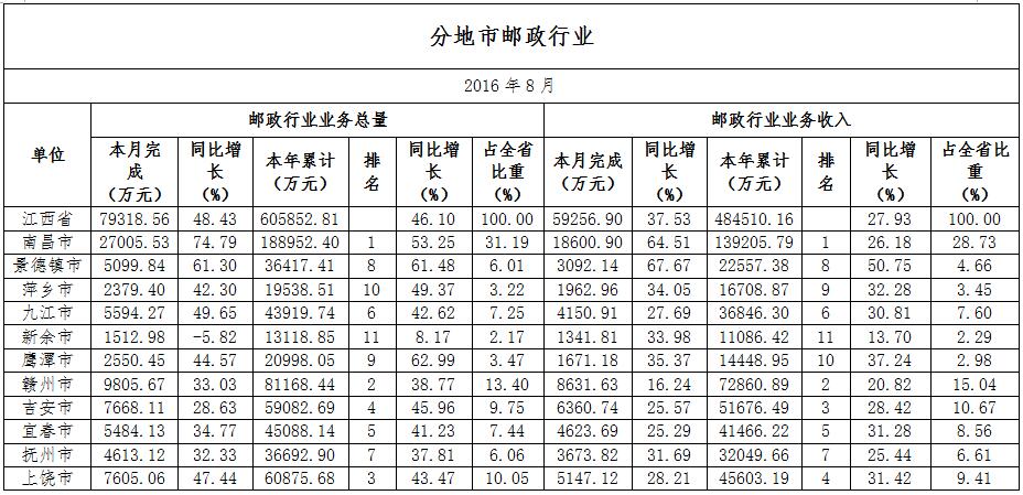 全省分地市郵政行業(yè)全年累計業(yè)務總量排名前五的地市依次是南昌、贛州、上饒、吉安、宜春。