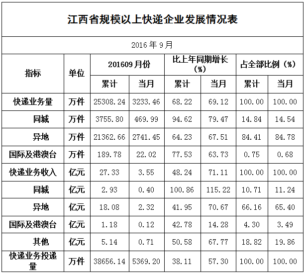 9月份,全省快遞服務(wù)企業(yè)業(yè)務(wù)量累計完成25308.24萬件,全國排第16位,同比增長68.22%;業(yè)務(wù)收入累計完成27.33億元,全國排第17位,同比增長48.24%。其中,同城業(yè)務(wù)收入累計完成2.93億元,同比增長100.86%;異地業(yè)務(wù)收入累計完成18.08億元,同比增長41.95%;國際及港澳臺業(yè)務(wù)收入累計完成1.18億元,同比增長42.78%。快遞業(yè)務(wù)投遞量累計完成38656.14萬件。