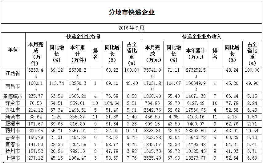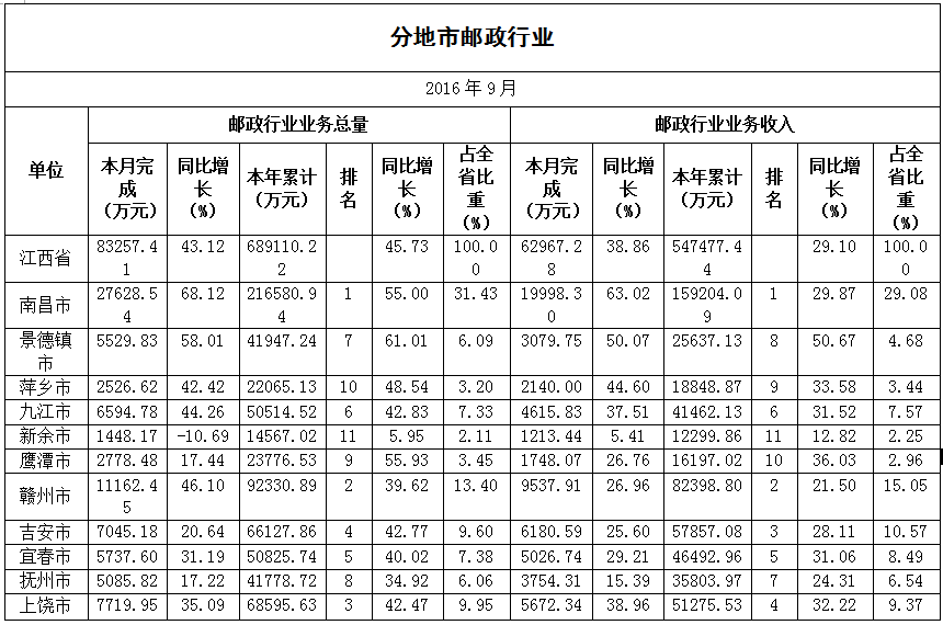 全省分地市郵政行業(yè)全年累計業(yè)務(wù)總量排名前五的地市依次是南昌、贛州、上饒、吉安、宜春。