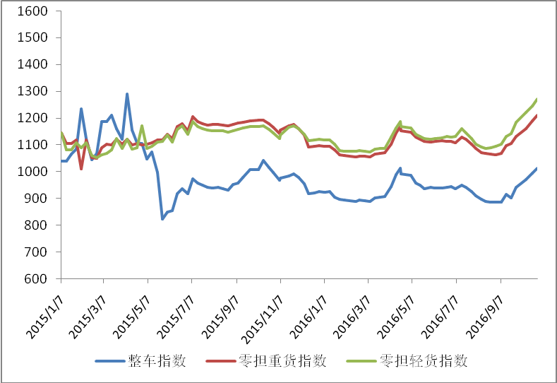 各車型指數(shù)環(huán)比均有不同程度回升,其中整車指數(shù)、零擔(dān)重貨運(yùn)輸指數(shù)環(huán)比回升幅度略低于零擔(dān)輕貨指數(shù)。本周,整車指數(shù)為1012.7點(diǎn),環(huán)比回升1.9%,比年初回升9.4%;零擔(dān)輕貨指數(shù)為1270.8點(diǎn),環(huán)比回升2.0%;零擔(dān)重貨指數(shù)為1211.1點(diǎn),環(huán)比回升1.9%。