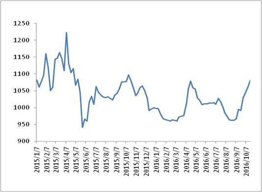 圖 1 2015-2016年各周中國(guó)公路物流運(yùn)價(jià)指數(shù)