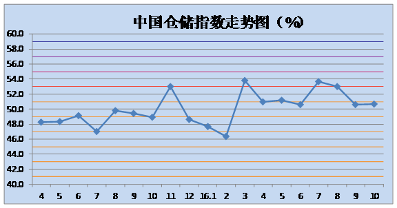中國物流與采購聯(lián)合會與中儲發(fā)展股份有限公司聯(lián)合調(diào)查的2016年10月中國倉儲指數(shù)為50.7%,較上月回升0.1個(gè)百分點(diǎn),連續(xù)八個(gè)月位于擴(kuò)張區(qū)間。各分項(xiàng)指數(shù)中,設(shè)施利用率指數(shù)、主營業(yè)務(wù)成本指數(shù)、期末庫存指數(shù)及企業(yè)員工指數(shù)較上月有所回升,其余指數(shù)均有不同程度的回落。