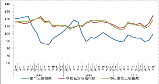 從分車(chē)型指數(shù)看,各車(chē)型指數(shù)比上月均較大幅度回升。其中,以大宗商品及區(qū)域運(yùn)輸為主的整車(chē)指數(shù)比上月回升明顯,為8.8%,至99.2點(diǎn)。與此同時(shí),電子商務(wù)等網(wǎng)上零售消費(fèi)需求明顯趨升,隨著“雙十一”電商促銷活動(dòng)臨近,貨主備貨需求較為集中,帶動(dòng)零擔(dān)物流需求較上月顯著回升。零擔(dān)指數(shù)中,零擔(dān)輕貨指數(shù)為124.6點(diǎn),比上月回升9.3%,比上年增長(zhǎng)7.3%;零擔(dān)重貨指數(shù)為118.7點(diǎn),比上月回升7.9%,比上年同期轉(zhuǎn)為增長(zhǎng)0.4%。