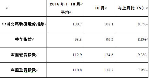 表1 2016年10月中國(guó)公路物流運(yùn)價(jià)指數(shù)表