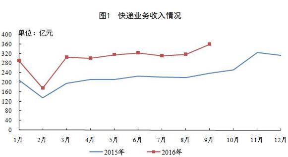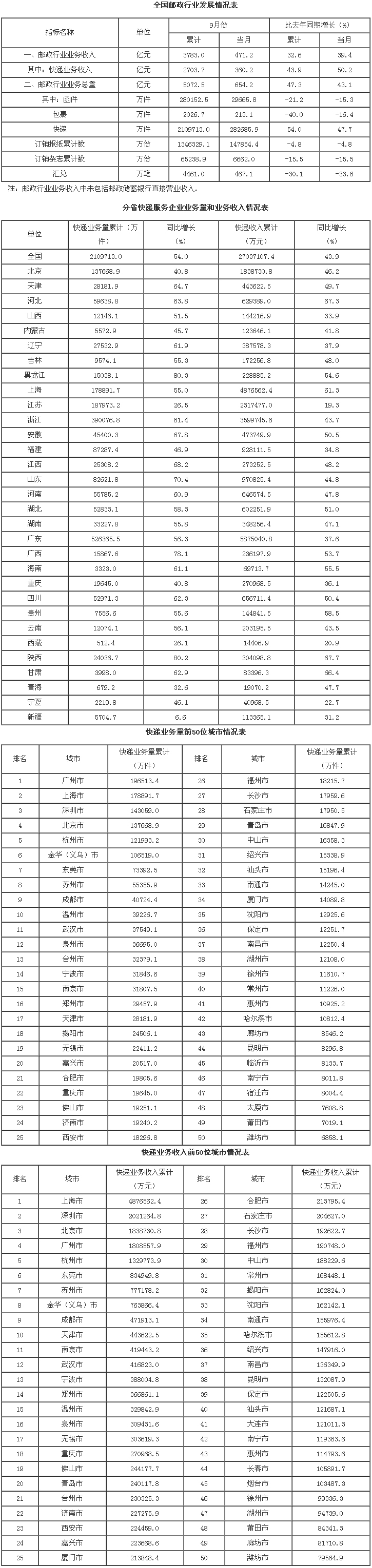 9月份,全行業(yè)業(yè)務(wù)收入完成471.1億元,同比增長39.4%;業(yè)務(wù)總量完成654.2億元,同比增長43.1%。