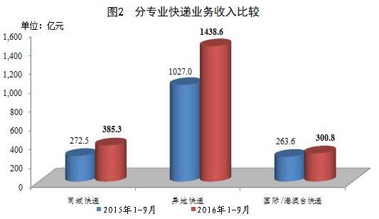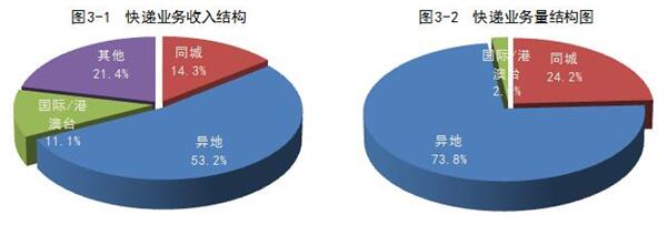 1-9月份,同城、異地、國際/港澳臺快遞業(yè)務(wù)收入分別占全部快遞收入的14.3%、53.2%和11.1%;業(yè)務(wù)量分別占全部快遞業(yè)務(wù)量的24.2%、73.8%和2%。與去年同期相比,同城快遞業(yè)務(wù)收入的比重下降0.2個百分點,異地快遞業(yè)務(wù)收入的比重下降1.5個百分點,國際/港澳臺業(yè)務(wù)收入的比重下降2.9個百分點。