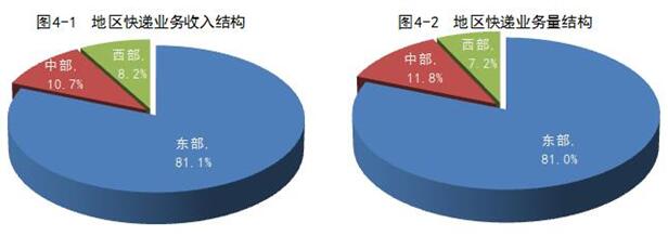 1-9月份,東、中、西部地區(qū)快遞業(yè)務(wù)收入的比重分別為81.1%、10.7%和8.2%,業(yè)務(wù)量比重分別為81%、11.8%和7.2%。與去年同期相比,東部地區(qū)快遞業(yè)務(wù)收入比重下降了0.6個百分點,快遞業(yè)務(wù)量比重下降了0.8個百分點;中部地區(qū)快遞業(yè)務(wù)收入比重上升了0.3個百分點,快遞業(yè)務(wù)量比重上升了0.6個百分點;西部地區(qū)快遞業(yè)務(wù)收入比重上升了0.3個百分點,快遞業(yè)務(wù)量比重上升了0.2個百分點。