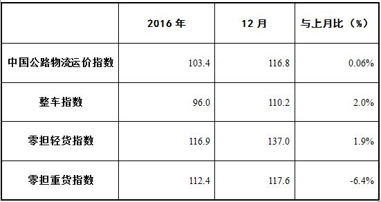 由中國(guó)物流與采購(gòu)聯(lián)合會(huì)和林安物流集團(tuán)聯(lián)合調(diào)查的中國(guó)公路物流運(yùn)價(jià)指數(shù)2016年12月為116.8點(diǎn),比上月回升0.06%,運(yùn)價(jià)指數(shù)連續(xù)四個(gè)月環(huán)比回升,比上年同期增長(zhǎng)15.3%,全年總體高于去年同期水平。9月份以來(lái),受到治超新政實(shí)施等因素影響,運(yùn)輸費(fèi)用持續(xù)上漲,加之物流需求穩(wěn)中有升,多重因素共同影響,帶動(dòng)價(jià)格指數(shù)連續(xù)回升。