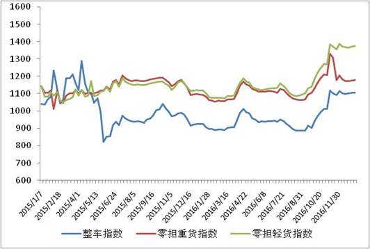 本周,公路物流市場(chǎng)需求總體延續(xù)了前期的平穩(wěn)走勢(shì),但受到部分地區(qū)霧霾等天氣因素影響,運(yùn)輸成本有所上漲,價(jià)格指數(shù)連續(xù)三周小幅回升。從后期走勢(shì)看,隨著春節(jié)假期臨近,公路運(yùn)輸市場(chǎng)需求可能有所趨緩,運(yùn)價(jià)指數(shù)將延續(xù)平穩(wěn)走勢(shì)。