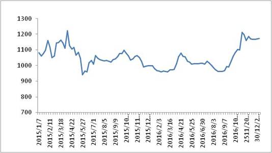 圖 1 2016-2017年各周中國(guó)公路物流運(yùn)價(jià)指數(shù)