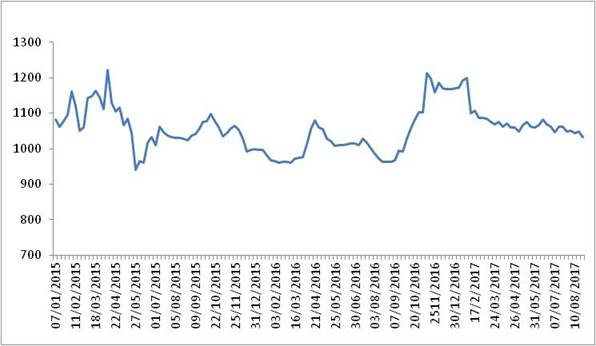 圖 1 2015-2017年各周中國公路物流運(yùn)價指數(shù)