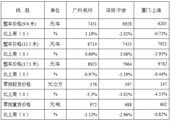 表1 本周部分線路平均價格及環(huán)比情況對比