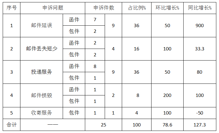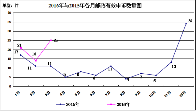 2016年3月,消費(fèi)者關(guān)于郵政服務(wù)問題的有效申訴25件,環(huán)比增長78.6%,同比增長127.3%。