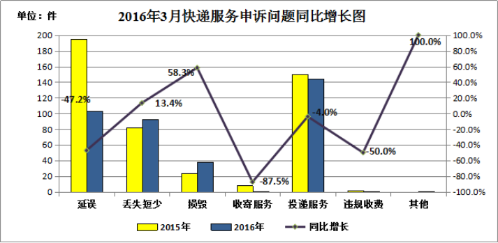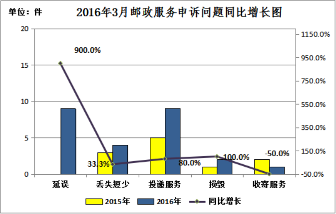 2016年3月,消費(fèi)者對郵政服務(wù)的申訴同比呈增長趨勢,其中郵件延誤、郵件損毀、投遞服務(wù)和郵件丟失短少,分別增長900%、100%、80%、33.3%;收寄服務(wù)質(zhì)量較去年有所提升,消費(fèi)者申訴下降50%。
