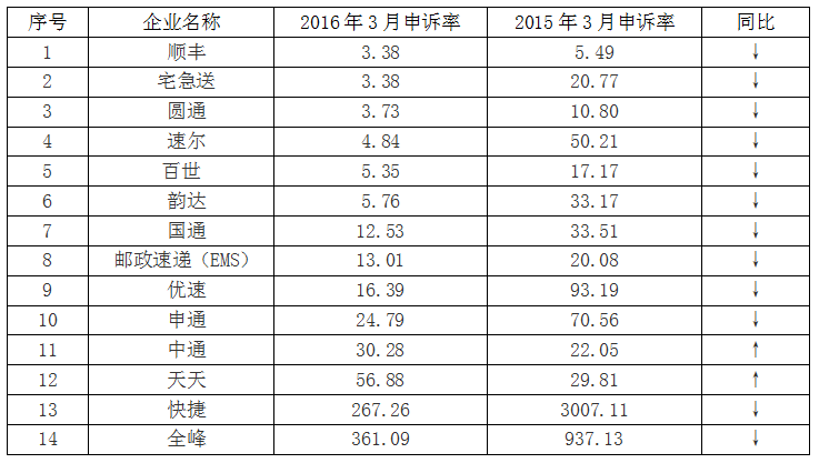 2016年3月,全省快遞服務(wù)有效申訴率為平均每百萬件快件13.28,環(huán)比每百萬件快件減少21.37件,同比減少16.61件。
