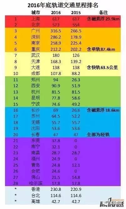 再來看看截至2016年年底,全國各大城市地鐵通車?yán)锍膛琶?/p>