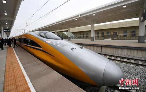 資料圖:2017年3月21日,新型CRH380AJ--0203動(dòng)車(chē)組列車(chē)“黃醫(yī)生”從蘭州西車(chē)站高速場(chǎng)上線,開(kāi)始檢測(cè)寶蘭客專蘭州西站至東岔站間334公里高鐵行車(chē)設(shè)備,寶蘭客專(蘭州局管段)聯(lián)調(diào)聯(lián)試正式啟動(dòng)。楊艷敏 攝