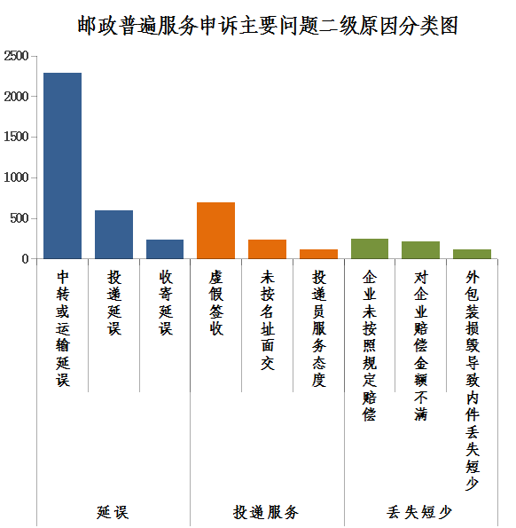2.郵政普遍服務(wù)申訴主要問題二級(jí)原因情況。郵件延誤申訴中主要占比較多的是中轉(zhuǎn)或運(yùn)輸延誤,投遞服務(wù)申訴中主要占比較多的是虛假簽收,郵件丟失短少申訴中主要占比較多的是企業(yè)未按照規(guī)定賠償。