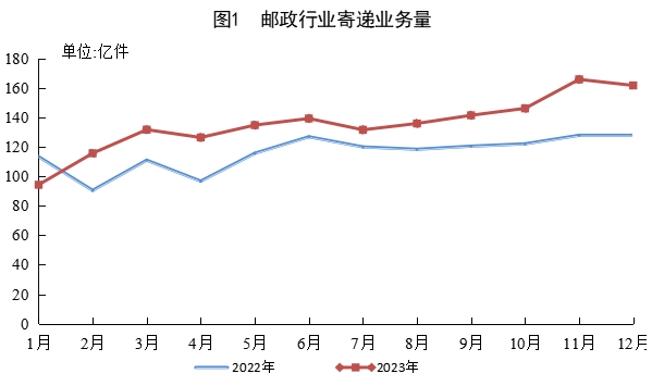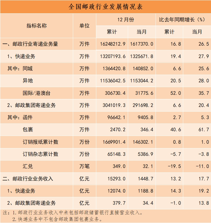 12月份,郵政行業(yè)寄遞業(yè)務(wù)量完成161.7億件,同比增長26.5%。其中,快遞業(yè)務(wù)量完成132.6億件,同比增長27.9%。