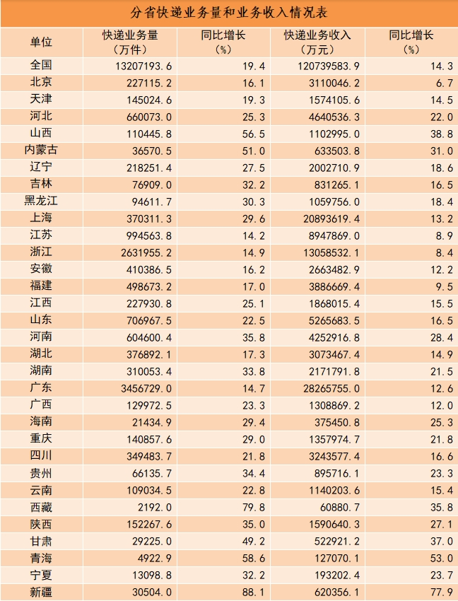 12月份,郵政行業(yè)業(yè)務(wù)收入完成1448.7億元,同比增長17.7%。其中,快遞業(yè)務(wù)收入完成1188.8億元,同比增長19.2%。