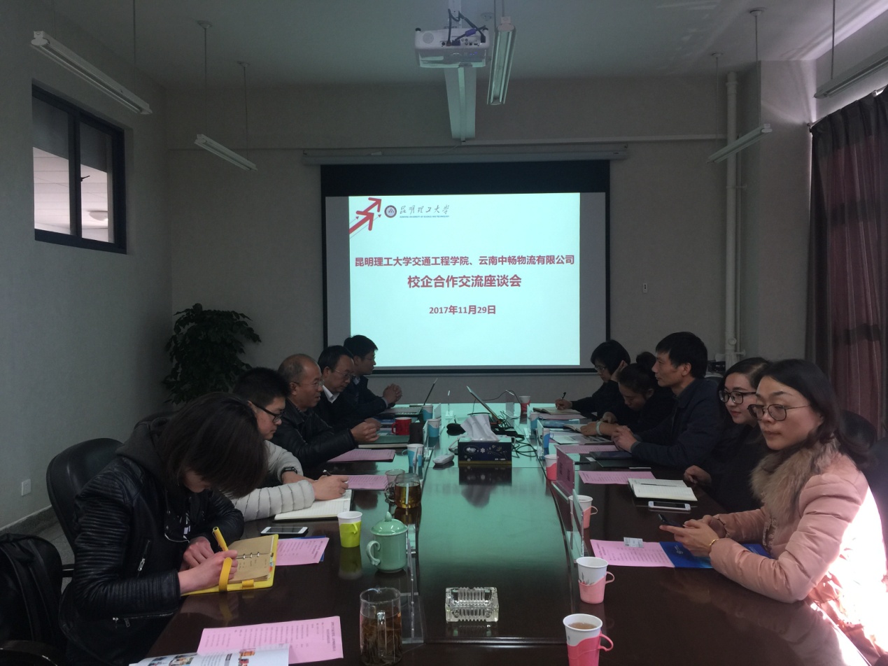 11月29日,云南中暢物流有限公司藍(lán)濟(jì)昌董事長一行5人,到昆明理工大學(xué)交通工程學(xué)院洽談校企合作事宜。交通工程學(xué)院黨政領(lǐng)導(dǎo)及物流系教師代表參加座談交流。