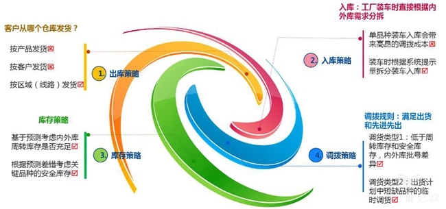規(guī)劃了外倉庫容問題后,緊接著就是物流計劃策略的制定與調(diào)整,包括出庫策略、入庫策略、庫存策略和調(diào)撥策略,以解決內(nèi)倉和外倉之間的庫存存儲與調(diào)撥、訂單分配、庫存管理、產(chǎn)品貨期混亂不滿足先進先出,內(nèi)部調(diào)撥成本和操作成本等問題。
