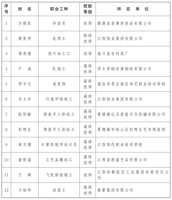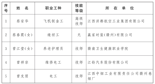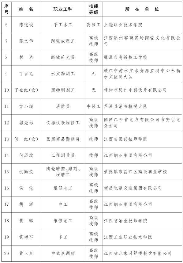 第七屆江西省優(yōu)秀高技能人才表彰名單