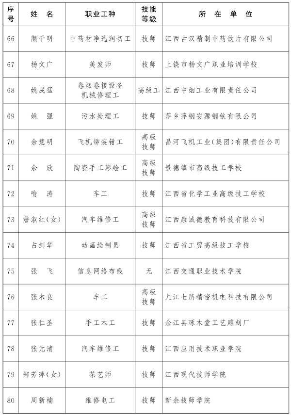 二、“江西省能工巧匠”(共80人,按拼音排序)