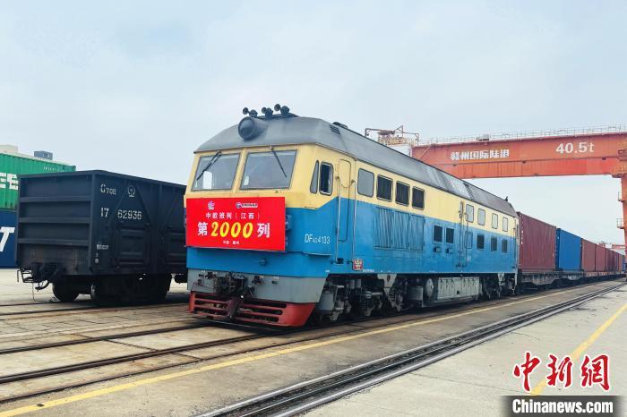 11月19日電(吳鵬泉?jiǎng)⒘⑵?11月19日,隨著X8208次中歐班列從江西贛州國際陸港緩緩駛出,江西中歐班列累計(jì)開行數(shù)量突破2000列。