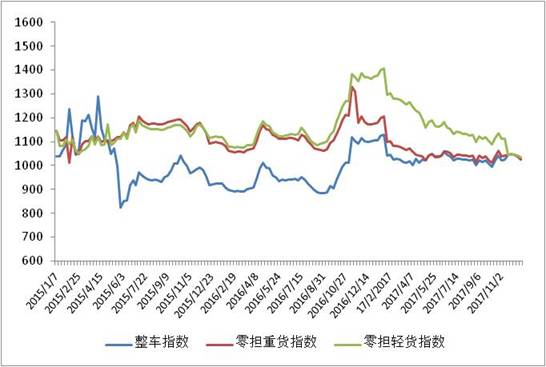 本周(2017年12月25日~12月29日),由中國(guó)物流與采購(gòu)聯(lián)合會(huì)和林安物流集團(tuán)聯(lián)合調(diào)查的中國(guó)公路物流運(yùn)價(jià)指數(shù)1012.35點(diǎn),環(huán)比回落1.63%。