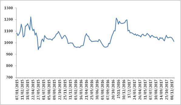圖 1 2015-2017年各周中國(guó)公路物流運(yùn)價(jià)指數(shù)