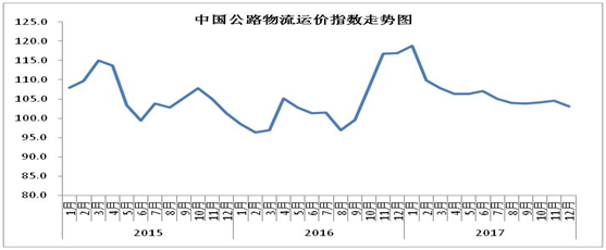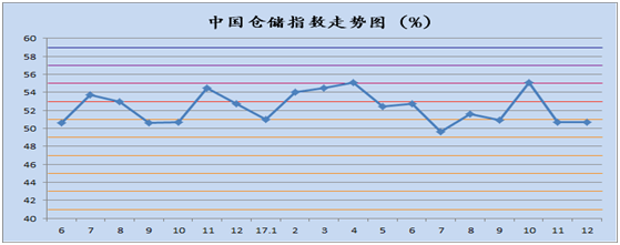 中國(guó)物流與采購(gòu)聯(lián)合會(huì)發(fā)布的2017年12月份中國(guó)物流業(yè)景氣指數(shù)為56.6%較上月回落2個(gè)百分點(diǎn);中國(guó)倉(cāng)儲(chǔ)指數(shù)為50.7%,與上月持平;中國(guó)公路物流運(yùn)價(jià)指數(shù)為103.1點(diǎn),比上月回落1.32%。
