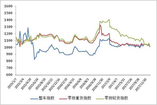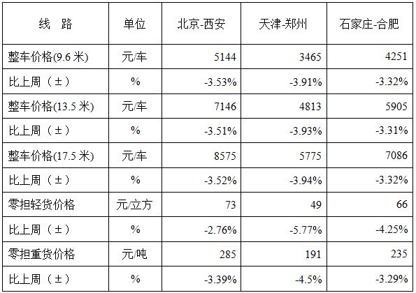 各車(chē)型指數(shù)均有不同程度回落,其中整車(chē)指數(shù)回落幅度高于零擔(dān)指數(shù),在零擔(dān)指數(shù)中零擔(dān)重貨指數(shù)回落幅度高于零擔(dān)輕貨指數(shù)。其中,整車(chē)指數(shù)為1012.25點(diǎn),比上周回落3.54%;零擔(dān)輕貨指數(shù)為1025.87點(diǎn),環(huán)比回落3.39%;零擔(dān)重貨指數(shù)為1010.69點(diǎn),環(huán)比回落3.49%。