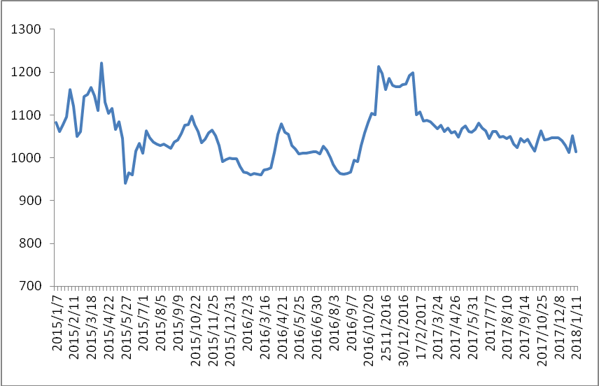 圖 1 2015-2018年各周中國(guó)公路物流運(yùn)價(jià)指數(shù)