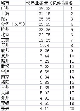 快遞業(yè)務(wù)量前20名城市