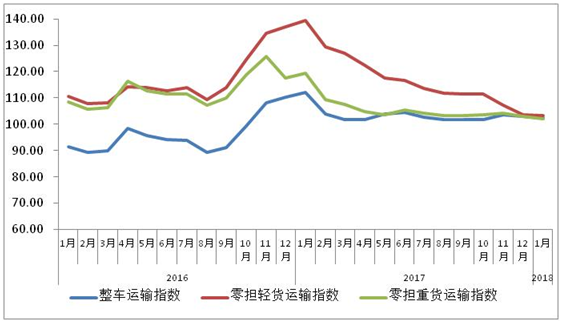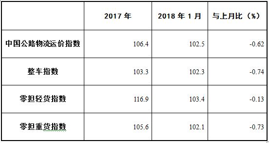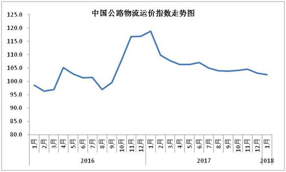 由中國物流與采購聯(lián)合會(huì)和林安物流集團(tuán)聯(lián)合調(diào)查的中國公路物流運(yùn)價(jià)指數(shù)2018年1月為102.5點(diǎn),比上月回落0.62%,連續(xù)兩個(gè)月小幅回落。