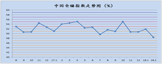 中國物流與采購聯(lián)合會發(fā)布的2018年2月份中國物流業(yè)景氣指數(shù)為50%,較上月回落4.2個百分點;中國倉儲指數(shù)為48.4%,較上月回落3.5個百分點;中國公路物流運價指數(shù)為99.6點,比上月回落2.8%。