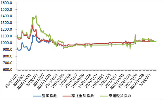 分車型看,各車型指數(shù)環(huán)比漲跌互現(xiàn)。其中,整車指數(shù)為1024.59點,比上周回升0.04%;零擔輕貨指數(shù)為1020.17點,比上周回落0.02%;零擔重貨指數(shù)為1023.64點,比上周回落0.11%。