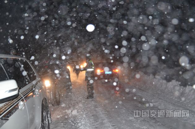3月11日晚,武警交通二支隊(duì)官兵在暴風(fēng)雪中疏導(dǎo)川藏線被困車輛。王毅凱 攝